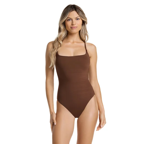 One piece swimsuit features textured fabric and a lace-up back. Offers a high-leg design and moderate coverage.