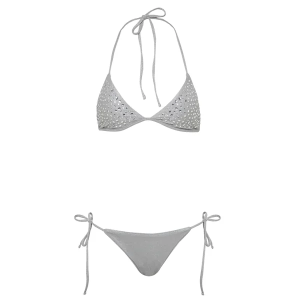 Balminess triangle bikini top is adorned with elegant rhinestones and crafted from luxurious metallic fabric. Offers removable cups and adjustable neck and back ties.