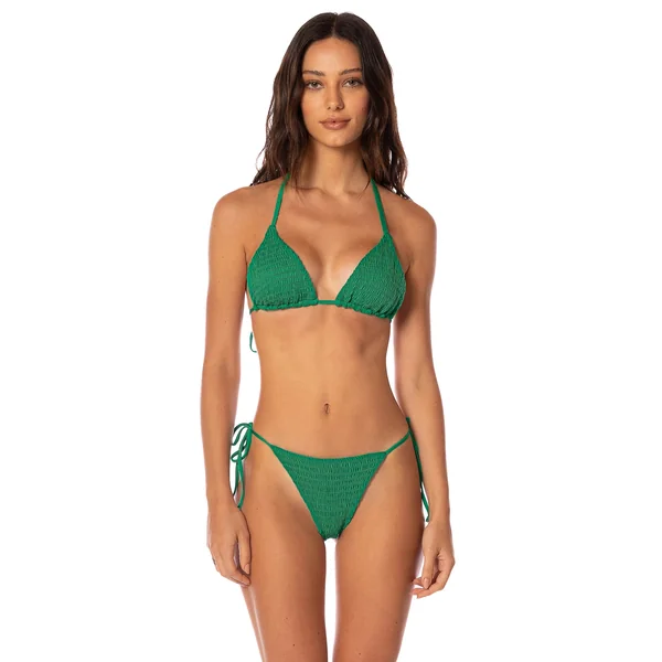 Balmy triangle bikini top features smocked fabric and offers removable cups and adjustable ties at neck and back.
