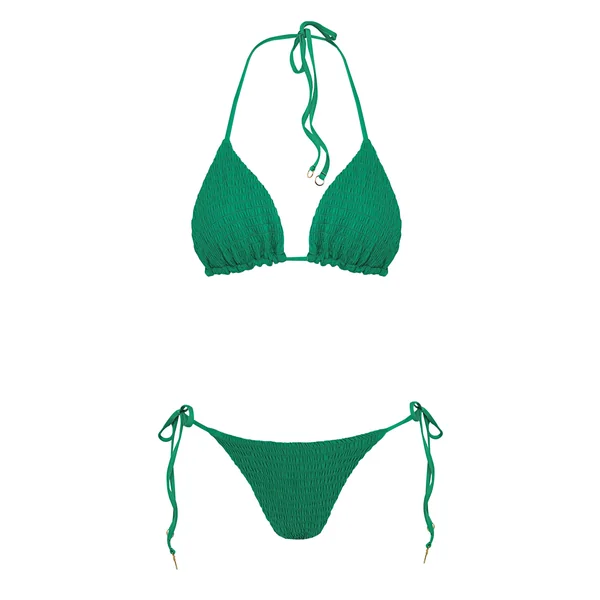 Balmy triangle bikini top features textured fabric and offers removable cups and adjustable ties at neck and back.