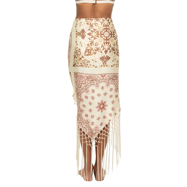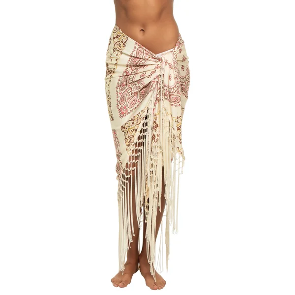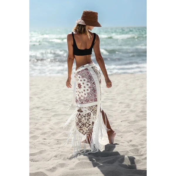 Self tie sarong features bandana print and long fringe trim that moves effortlessly with every step. Lightweight and versatile, it can be styled multiple ways.