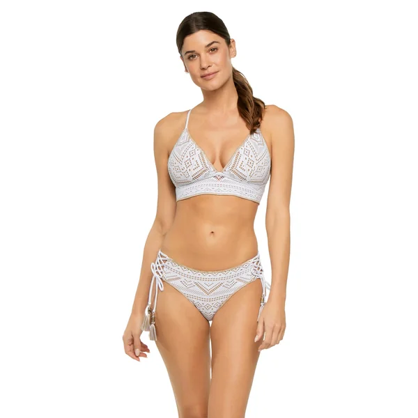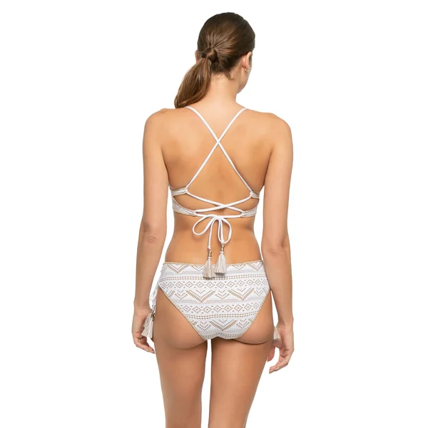Bikini top features intricate crochet overlay and a flattering v-neckline and a thick under bust band for added support. Offers an x-back fit with thin adjustable tassel-tipped ties for a customizable fit.