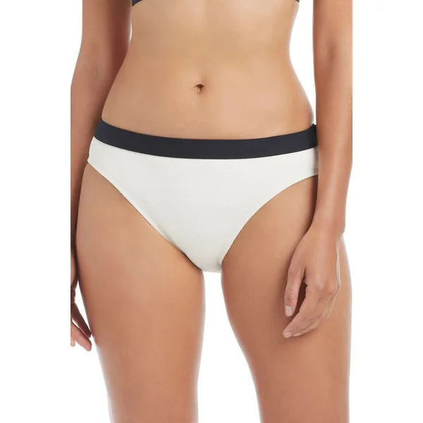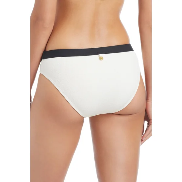 Hipster bikini bottom features a shirred banded waistband and delicate side string ties. Offers moderate coverage.