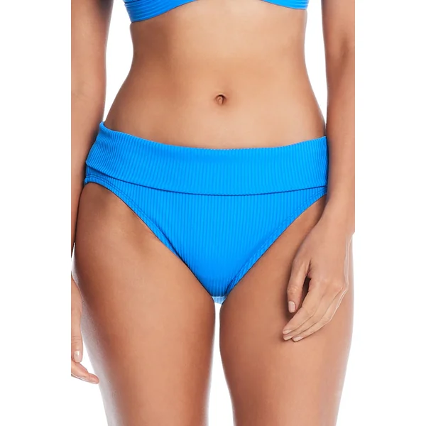 Hipster bikini bottom features ribbed fabric and a fold-over waistband. Offers moderate coverage.