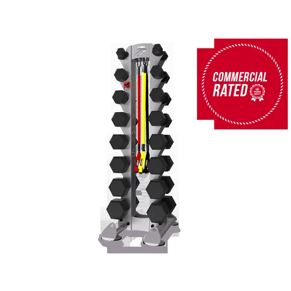 • Space saving robust design holds 8 pairs of Hex, Octagon or Pro Style Dumbbells