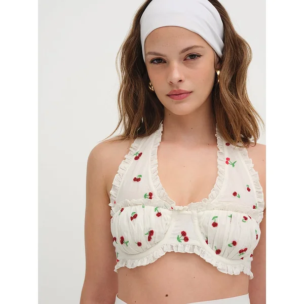 Celebrate romance with this beaded beauty. Crafted in a crisp white cotton, this vintage silhouette-inspired halter Bra is adorned with beaded cherries and ruffles at the edges.