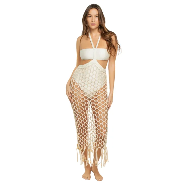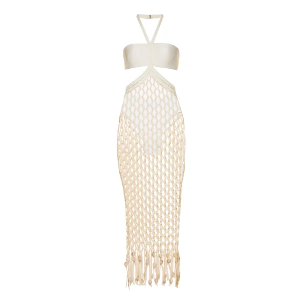 Two tone cover dress features halter neckline with braided strap detailing over a bandeau style top, side cut-outs, built in body suit and full woven mesh skirt with beading along the hemline. Offers a clasp closure at the neck.