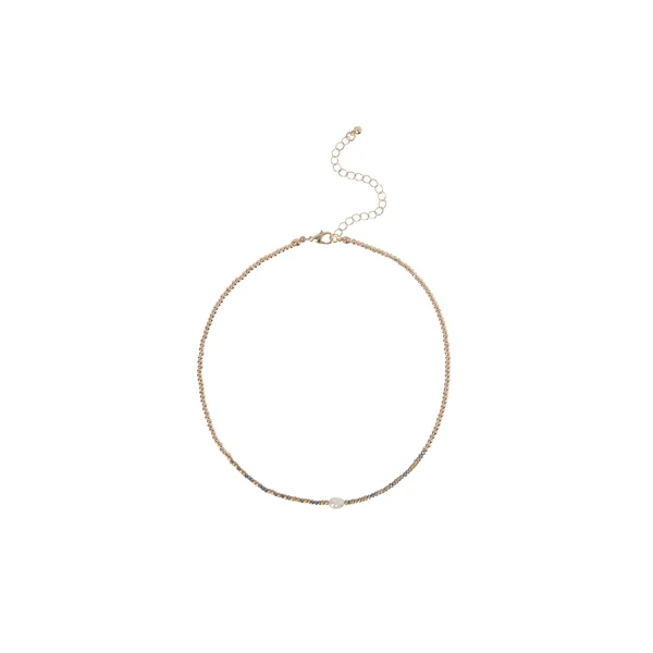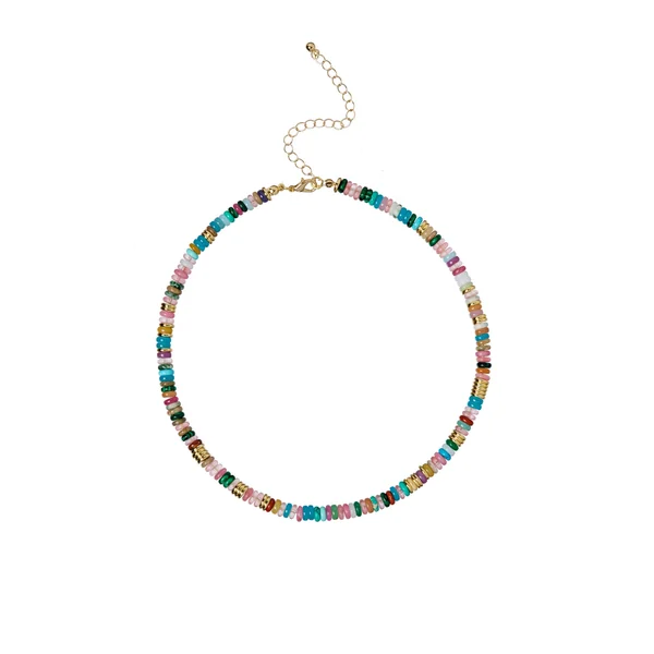 Multicolor beaded necklace with a lobster clasp closure and an extender.