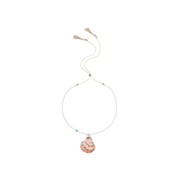 Necklace features acrylic beads with a natural shell centerpiece and a pull-clasp closure.