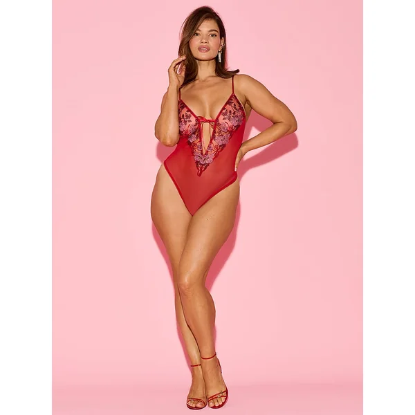 Red-hot and ravishing, our newest European-designed embroidery has romance all wrapped up this season. Decorated in bold blooms and bows, this stunning mesh Teddy is complete with a sexy, plunging neckline and tie-front accent.