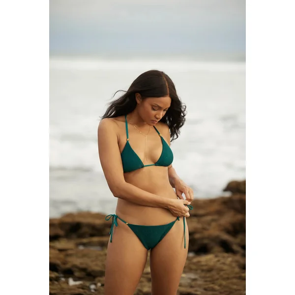 Bikini bottom features shimmery mesh overlay and 24k gold-plated accessories. Offers adjustable tie sides, cinched back and minimal bottom coverage.