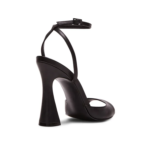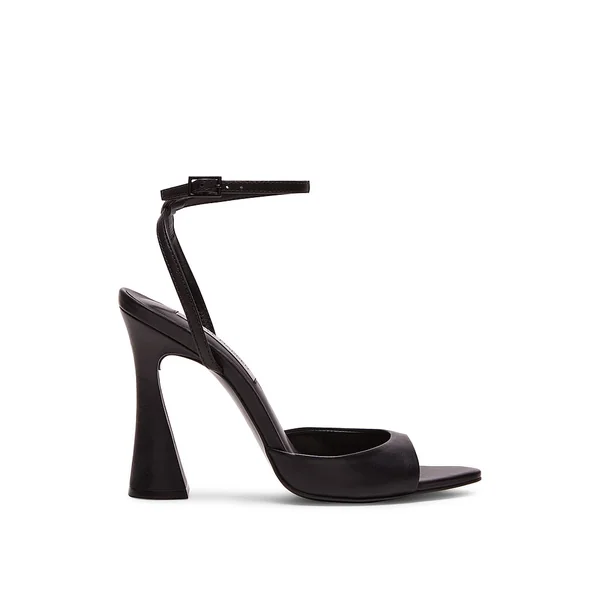 A pointy toe and flared block heel balance a striking sandal secured with an adjustable strap at the ankle