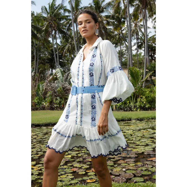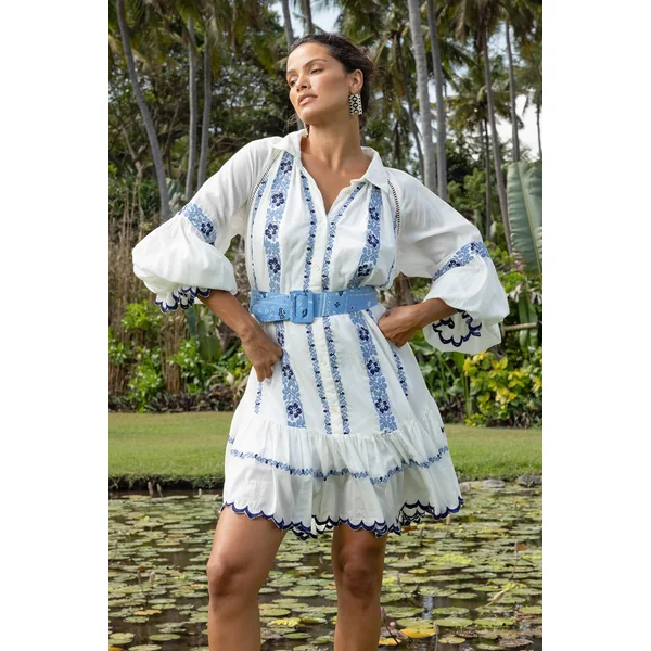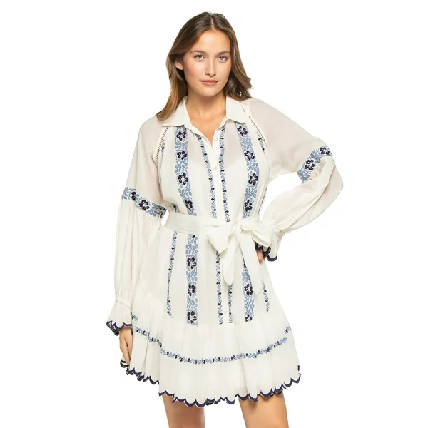 Bellerose lightweight cotton mini dress accented with with finely executed embroidery features long slightly puffed sleeves with gathering at the cuffs and a romantic scalloped hem. Offers a button up front and a matching adjustable tie belt.