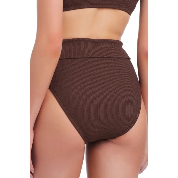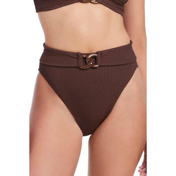 Bikini bottom features ribbed fabric, high waistline, attached belt with chain link accent, and moderate coverage.