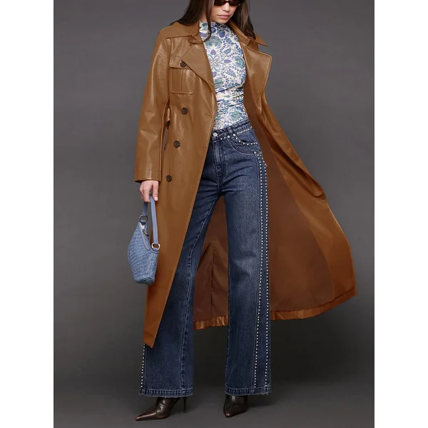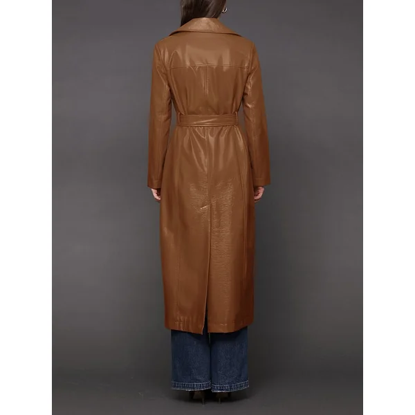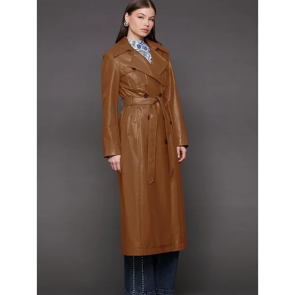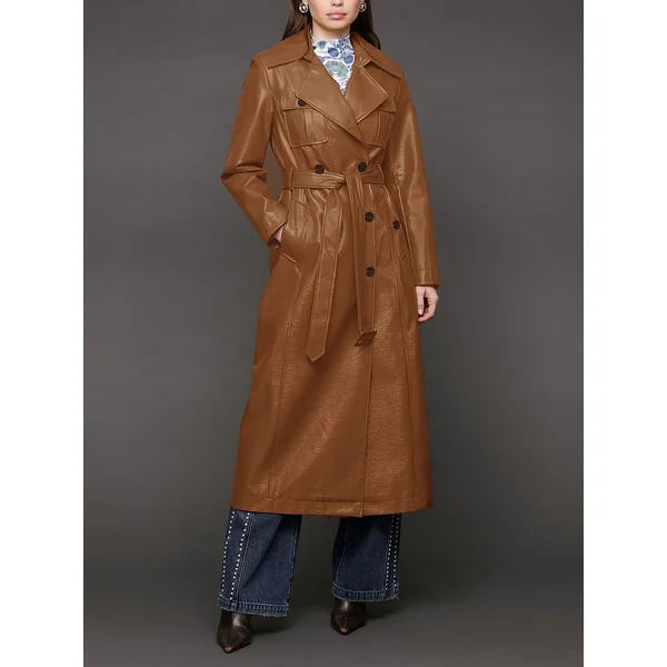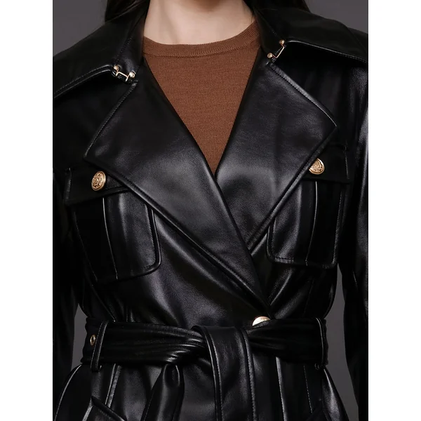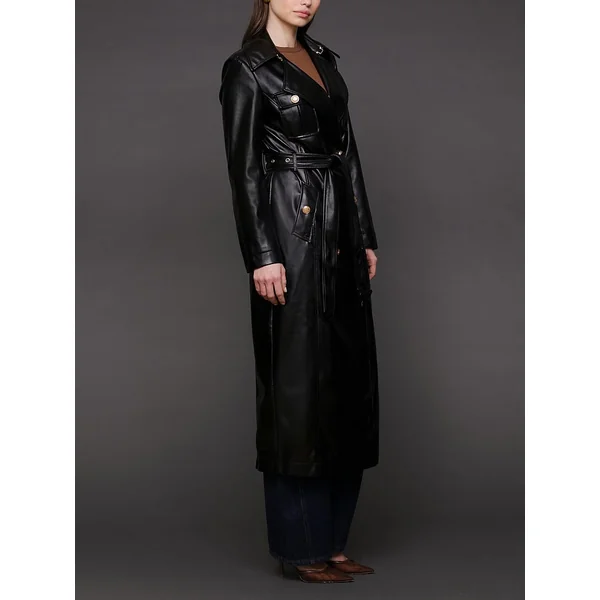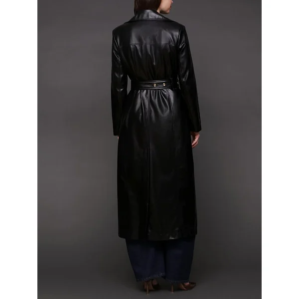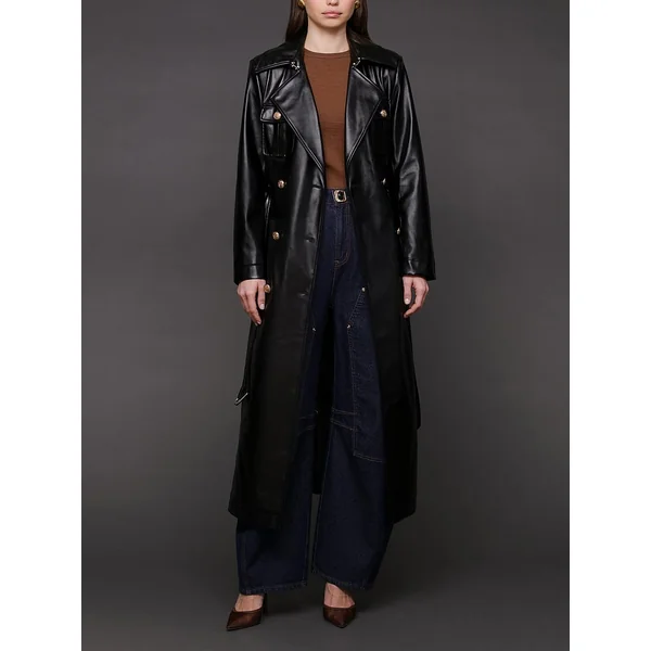 Consider this the power move your closet’s been craving: a longline double-breasted trench in semi-gloss faux leather finished with a tough-luxe belt just waiting to cinch your waist and your status.