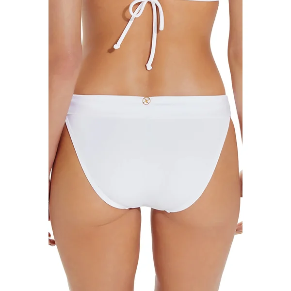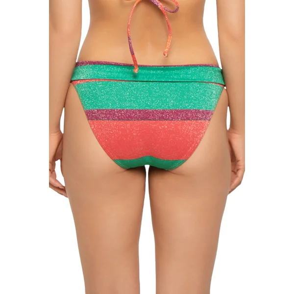 Bia tube banded hipster bikini bottom features 24k gold-plated sliders at hips. Offers moderate coverage. The heatwave print showcases stripes in varying widths, delicately woven with silver lurex threads for a touch of shimmer.