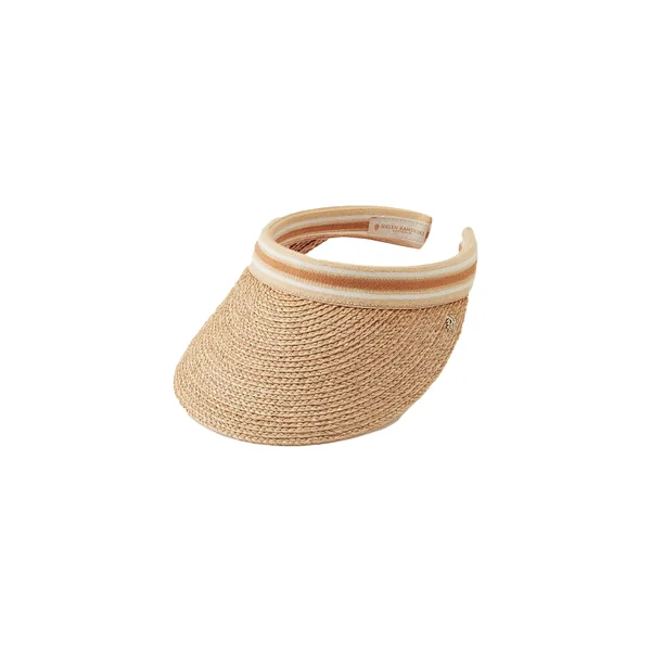 Bianca visor features handcrafted raffia, striped elastic band, and a comfortable slide on fit.