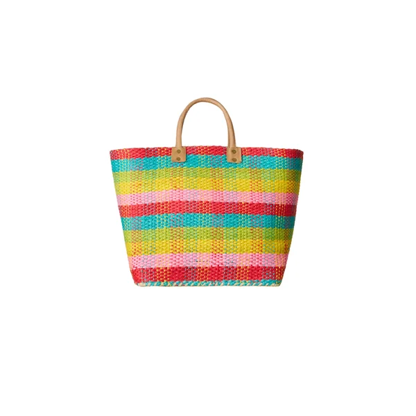 Bimini tote is crafted from handwoven sisal and seagrass, featuring leather handles and one interior slip pocket.