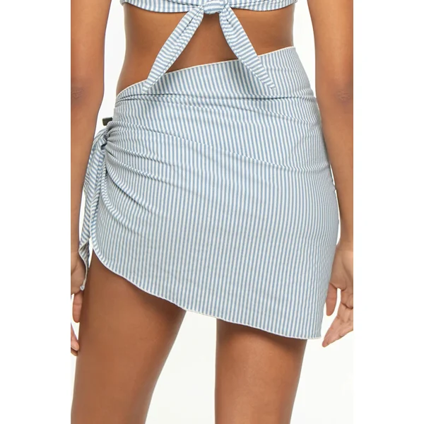 Sarong features blue striped print and offers a self tie waist closure.