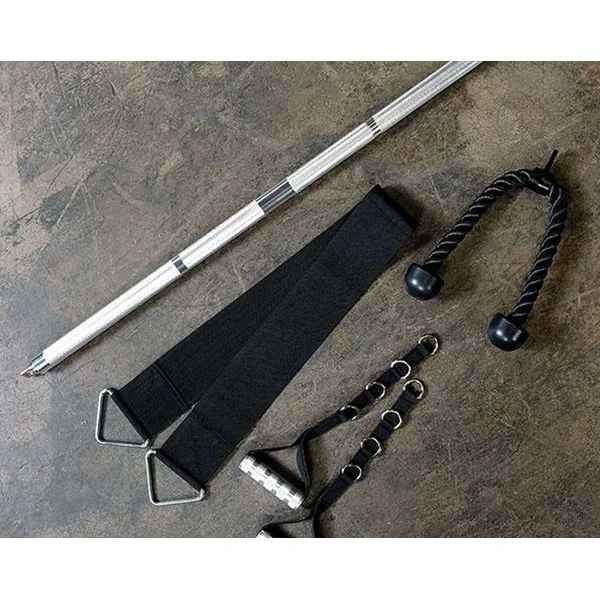 - Includes aluminum stirrup handles, triceps rope, chin & dip belt and double swivel bar
