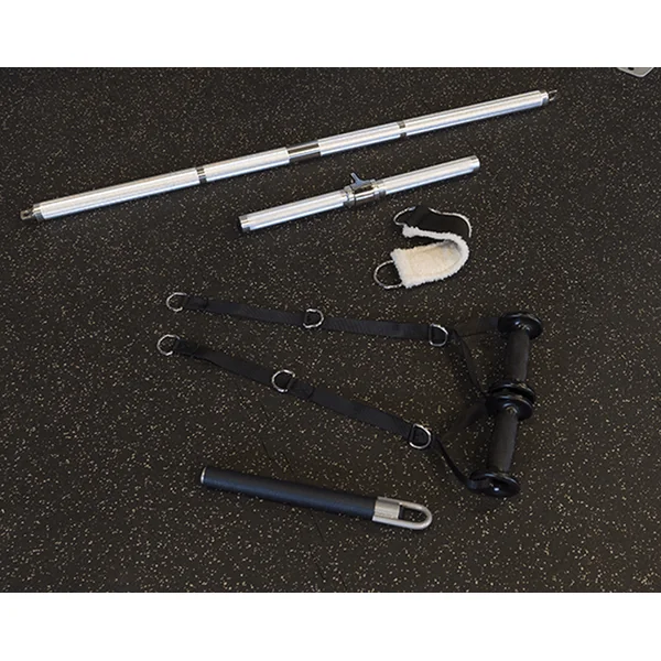 - Includes 43” revolving straight bar, 20″ straight bar, ankle strap, 2 nylon cable handles, and 14” athletic bar