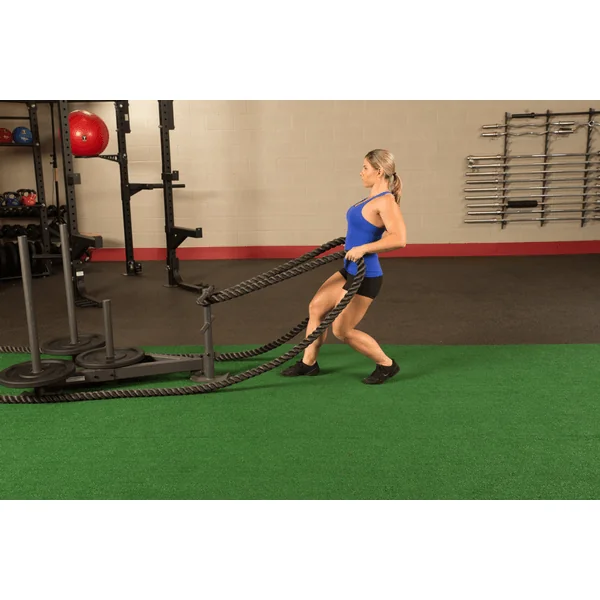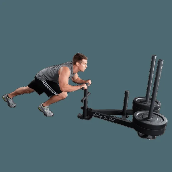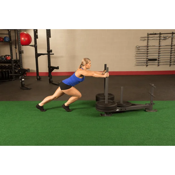 Body Solid’s GWS100 Weight Sled features a durable heavy-gauge solid steel mainframe. Along with the center weight post, the removable posts double as weight plate posts. Multiple attachment anchors allow you to attach almost any vest or belt giving this sled unmatched versatility. Vertical and horizontal hand posts offer several positions on both sides for pushing and pulling exercises.