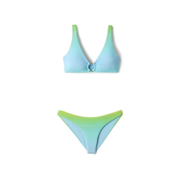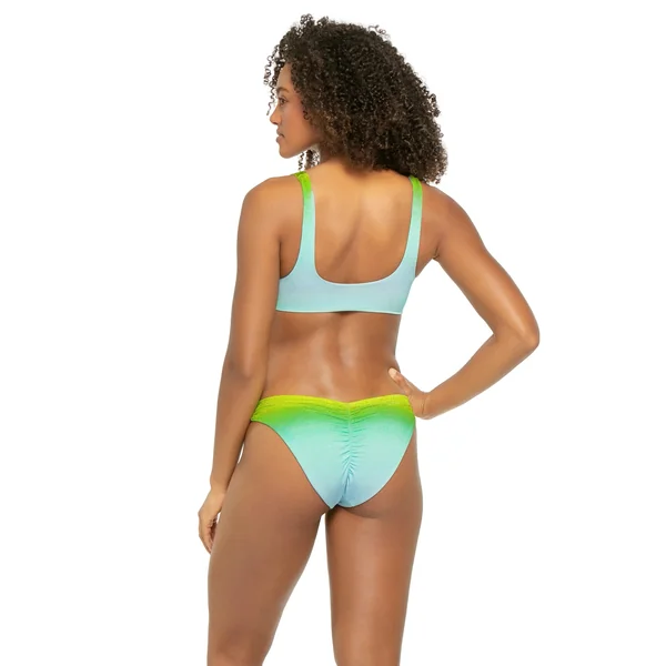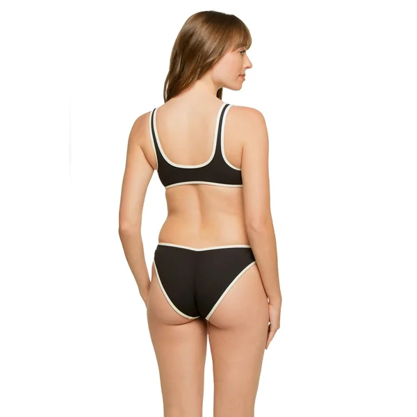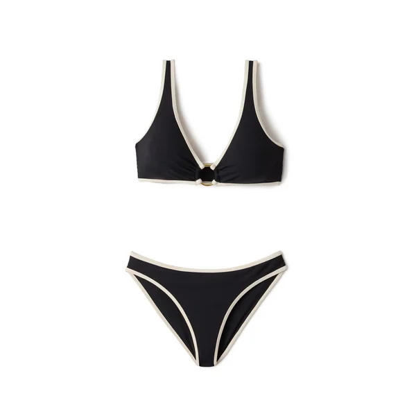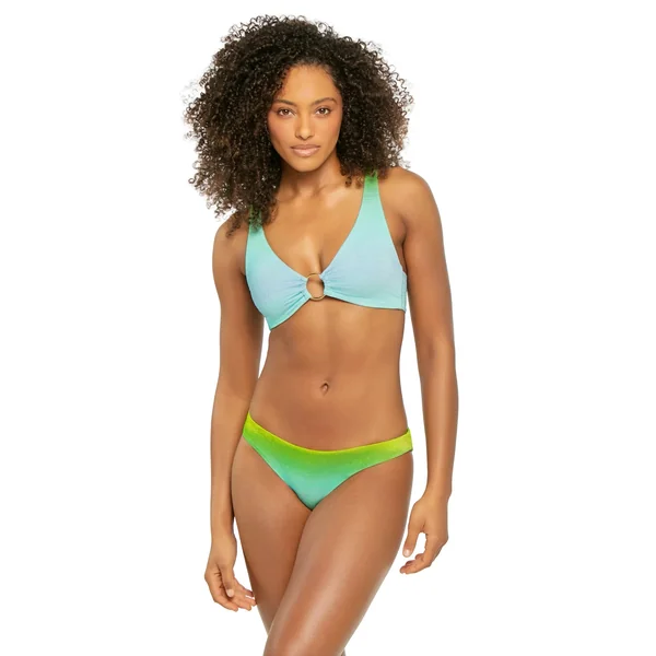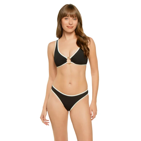 Bikini top features ribbed fabric with color block piped edges and v-neckline with gold ring connector. Offers fixed straps and a pull on fit.
