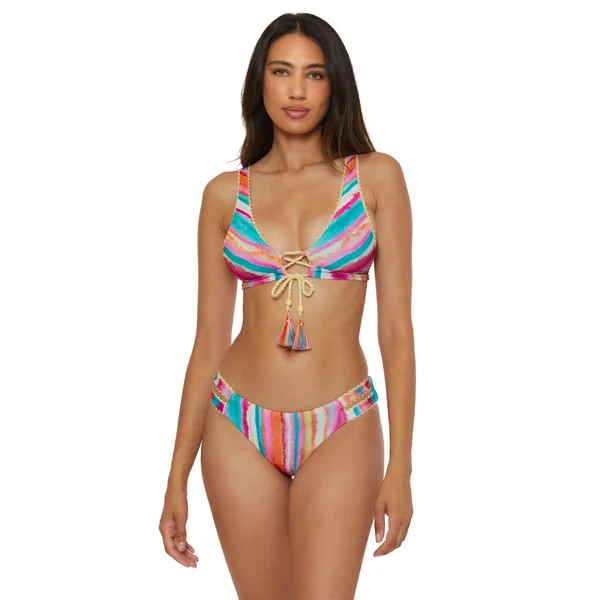 Bralette bikini top features picot edging and twisted cord lace-up front ties, accented with multicolored tassels and wooden beads. Offers adjustable straps and a hook back closure.