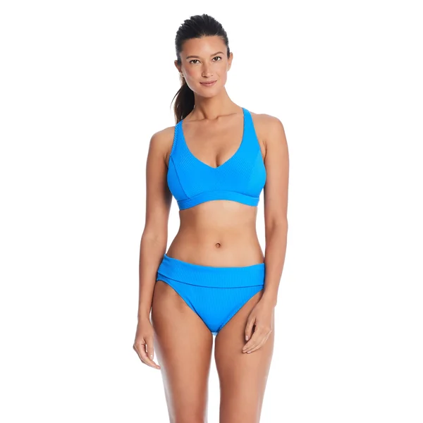 Bikini top features ribbed fabric and offers adjustable convertible straps, supportive underwire, and a hook back closure.