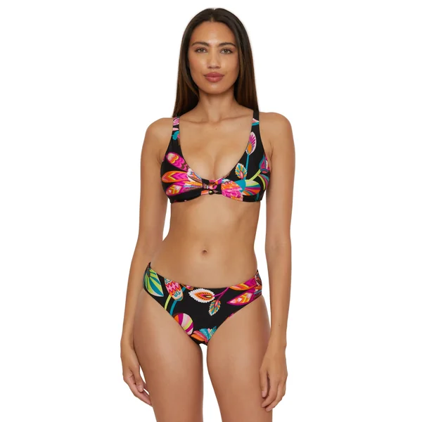 Bikini top features a gold plated ring accent and shirred cups. Offers removable soft cups, adjustable straps, and a lace-up tie back.