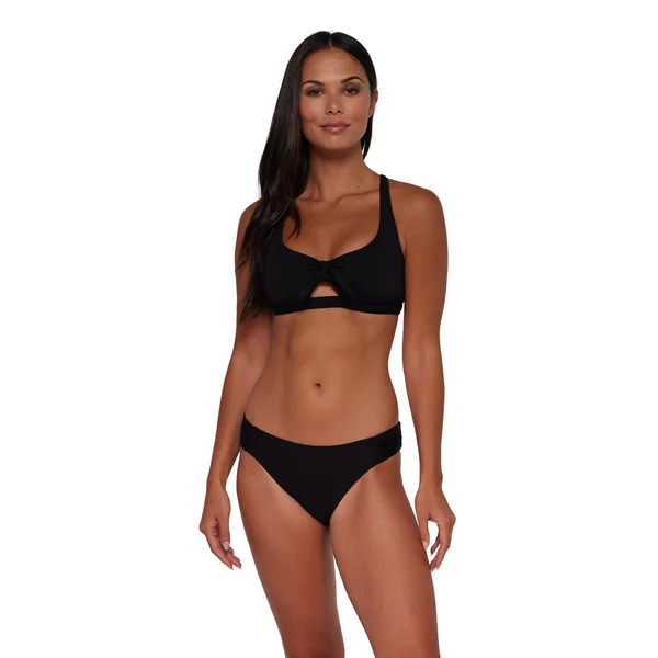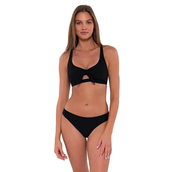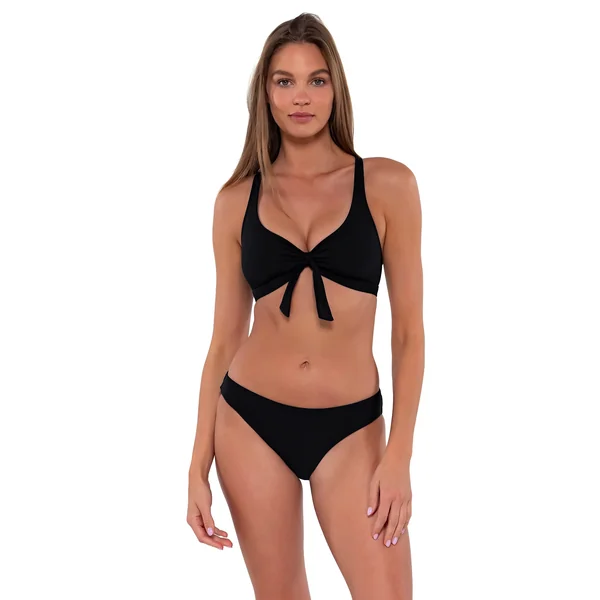 Functional, flattering, and customizable. Full adjustability in the back with criss cross strapping to ensure a perfect fit. Includes a removable front tie detail. Leave the tie off for a sports bra look or tie it in a bow for a deeper scooped front. Features include removable cups and matching colored lining.