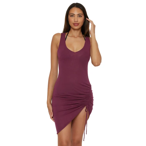 Mini dress features v-neck and adjustable drawstring skirt offering a customizable length.