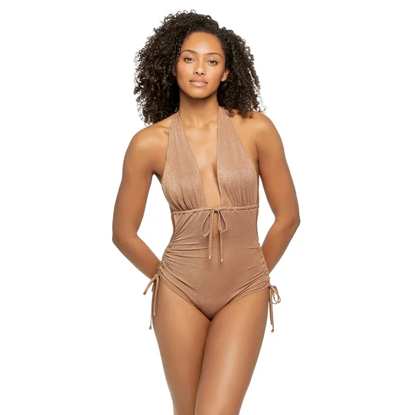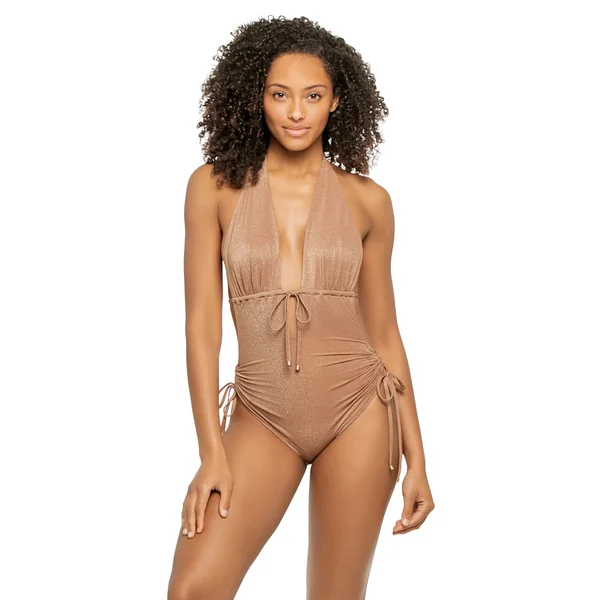 One piece swimsuit features shimmer fabric, a deep plunging neckline, underbust drawstring tie and adjustable side cinch ties. Offers removable soft cups, adjustable halter straps, and adjustable bottom coverage.
