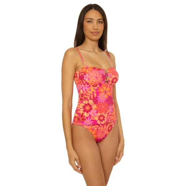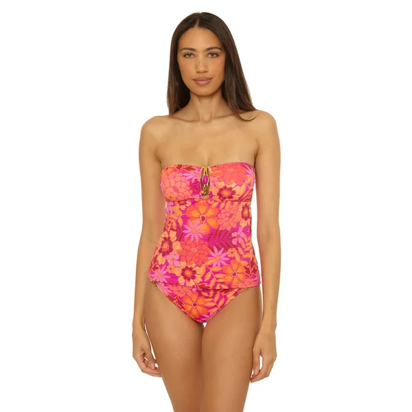 Textured tankini top features textured a gold buckle with marble stone inset detail. Offers molded cups, side stays, adjustable removable straps, and an adjustable tie back.
