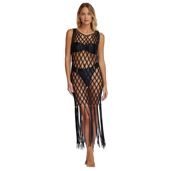 Cover up features intricate open weave macrame and long fringe hem woven with 24k gold-plated beads.