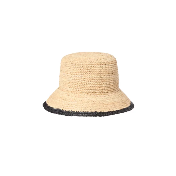 Bucket hat features woven raffia with a contrast border.