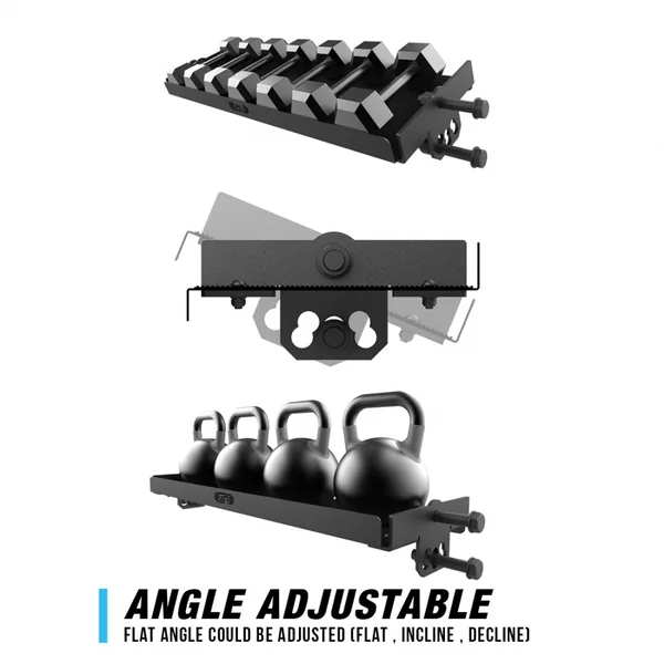 When flat, users can put kettlebells, dumbbells, lifting belts, and any other accessories across its 43″ length x 14″ depth surface. For easier access to dumbbells, we’ve also included the ability to install it angled which makes storing and removing dumbbells easier.