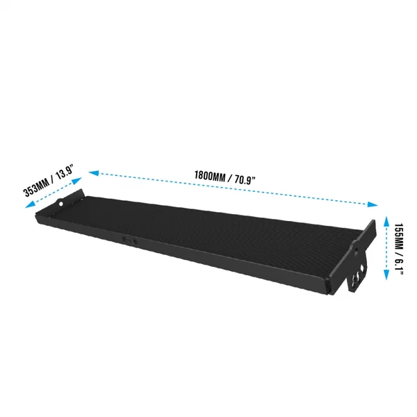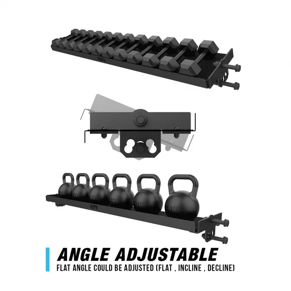 When flat, users can put kettlebells, dumbbells, lifting belts, and any other accessories across its 71″ length x 14″ depth surface. For easier access to dumbbells, we’ve also included the ability to install it angled which makes storing and removing dumbbells easier.