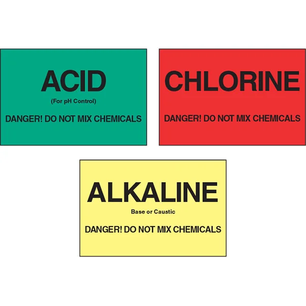 Bulk chemical solution tank labels help to easily identify tank contents and can help prevent the dangerous mixing of chemicals. Six label styles are available. Chemical solution tank labels have bright Day-Glo coloring and measure 11″ x 8 1/2″.