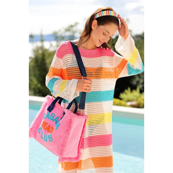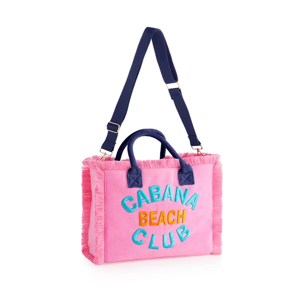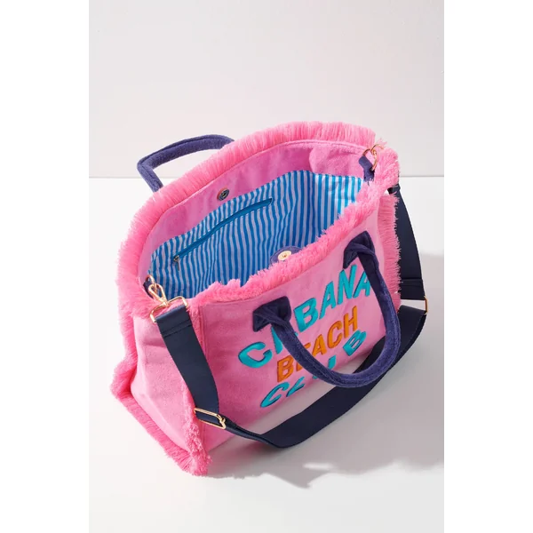 Cabana tote features soft terry cloth with bold “Cabana Beach Club” text, frayed trim, double top handles, and a removable shoulder strap.