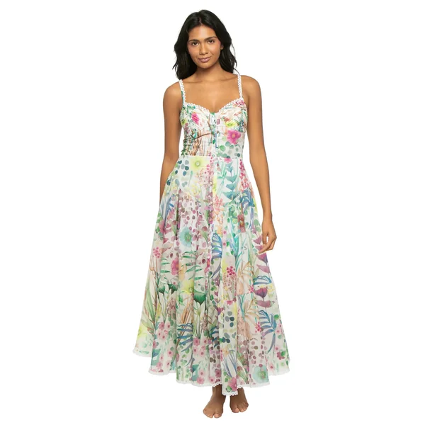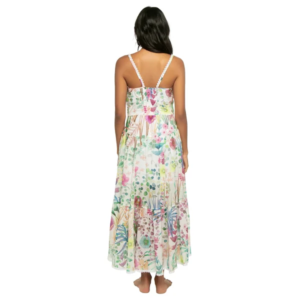 Maxi dress features floral garden print, lace trim along the neckline and straps and lace hem. Offers a button front and a smocked back for adjustability.