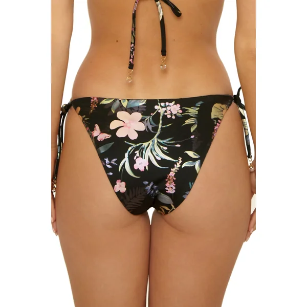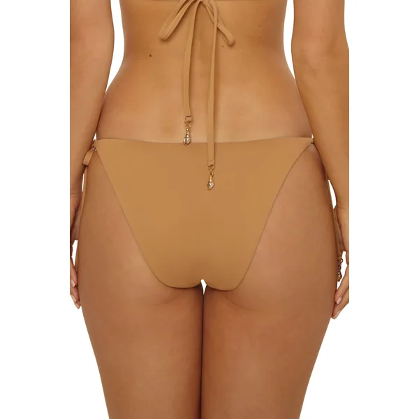 Brazilian bikini bottom features crochet knit with speckled metallic yarn and a scalloped edge along the waist. Offers adjustable ties adorned with shell charms and cheeky bottom coverage.