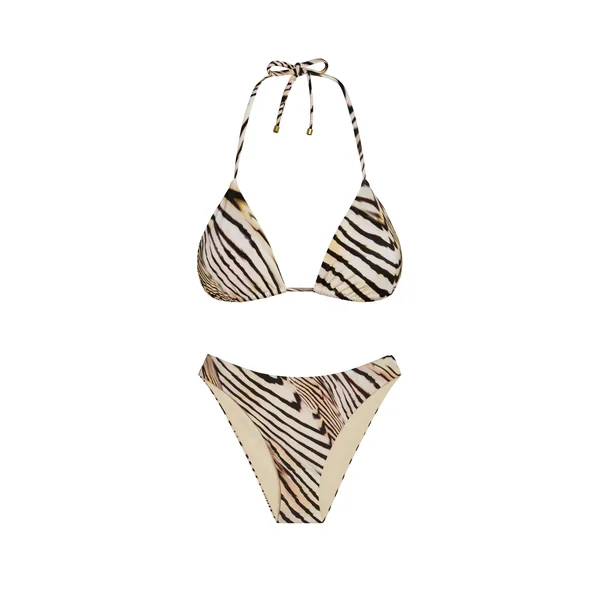Cali hipster bikini bottom features shell inspired striped print with subtle shimmer detail and offers moderate bottom coverage.