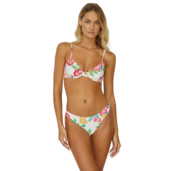 Cali bikini top features floral print and offers supportive underwire, adjustable straps, and a tie back closure.