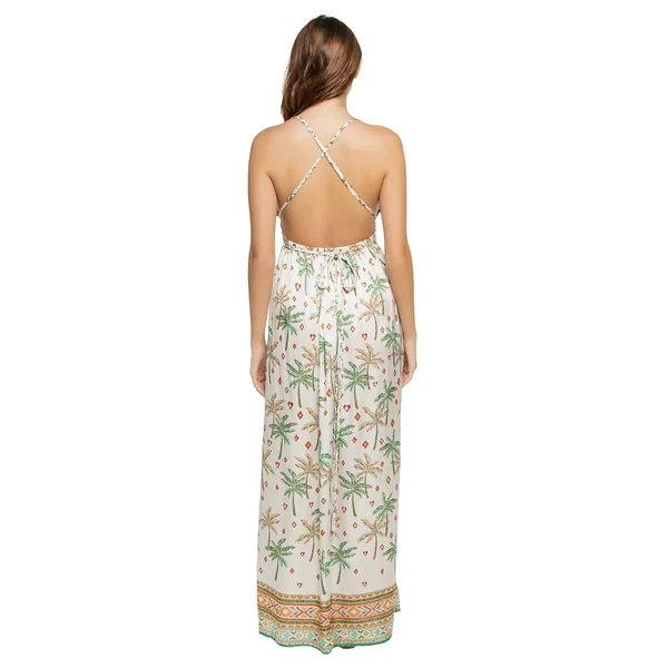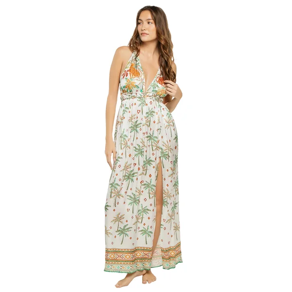 Calla maxi dress features tropical print, plunging neckline, adjustable wrap around braided straps, and a slit leg.