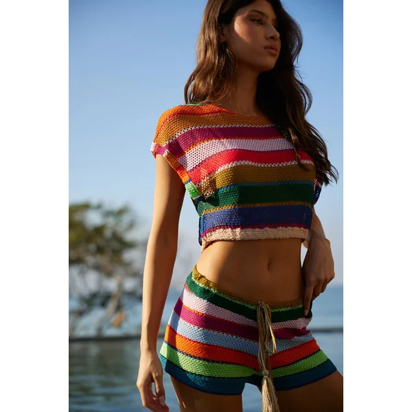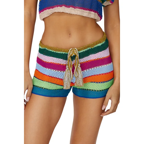 Calypso Bree shorts feature colorful open weave crochet and a drawstring waistband with decorative tassels.