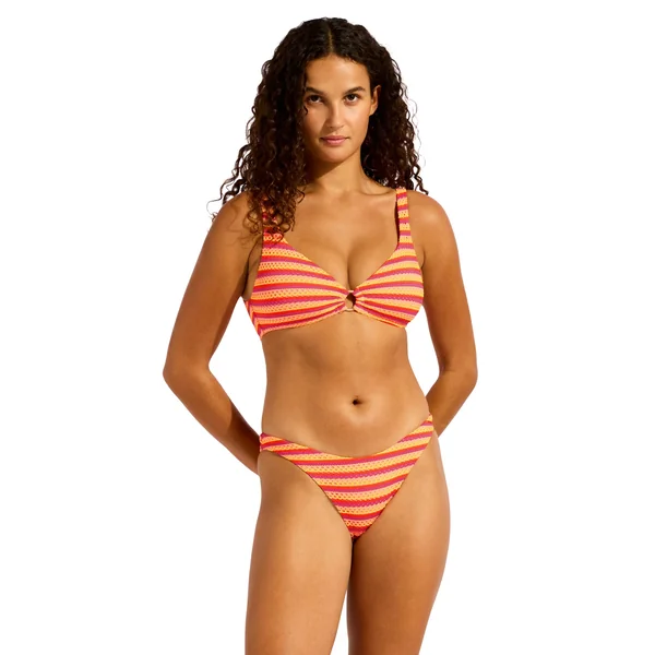 Bikini top features a crochet overlay, silver ring detail at the center, removable cups, and side boning. Offers an adjustable tie back closure.