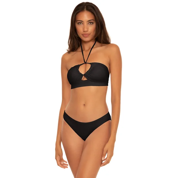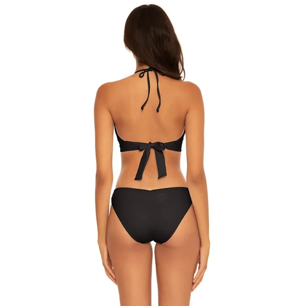 Candice halter bikini top features halter straps that can be worn multiple ways, removable soft cups and wide soft underbust band. Offers adjustable bra coverage and ties at the neck and back.