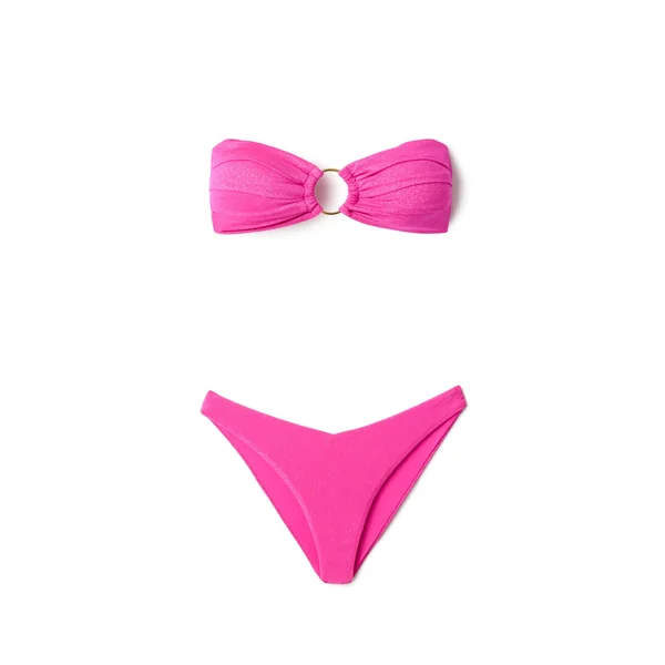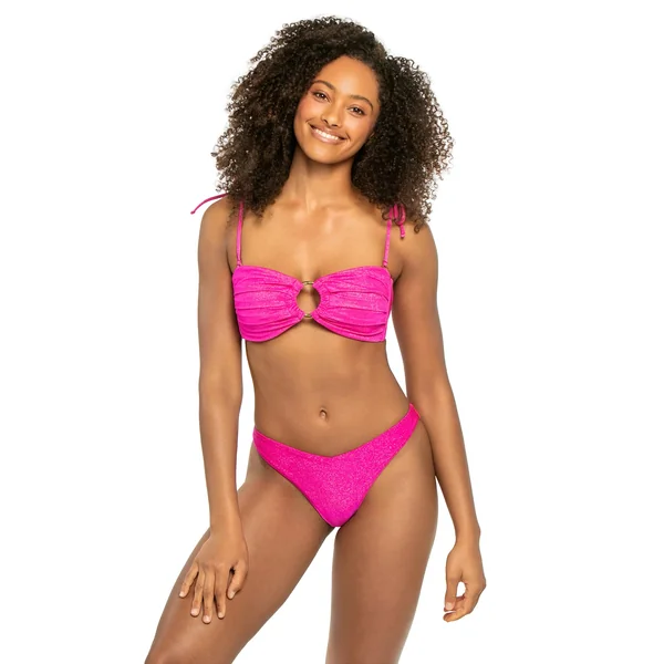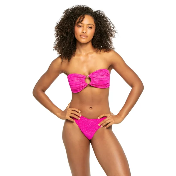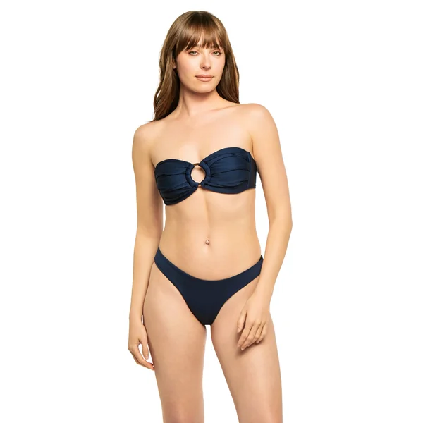 Cannes bandeau top features ribbed fabric, pleated cups, and center gold ring. Offers removable shoulder straps, removable soft cups, side stays, and adjustable tie back closure.