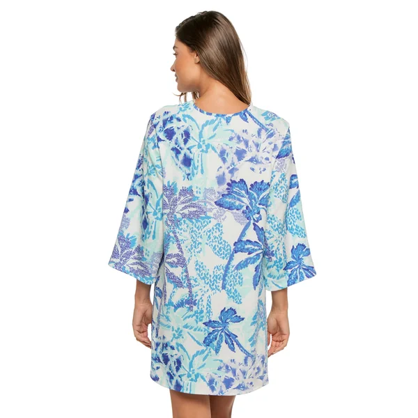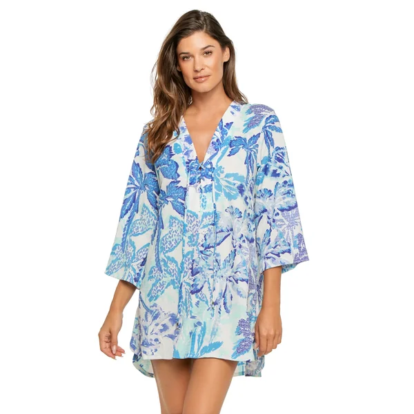 Tunic features tropical print, three-quarter sleeves, and a lace-up v-neckline.